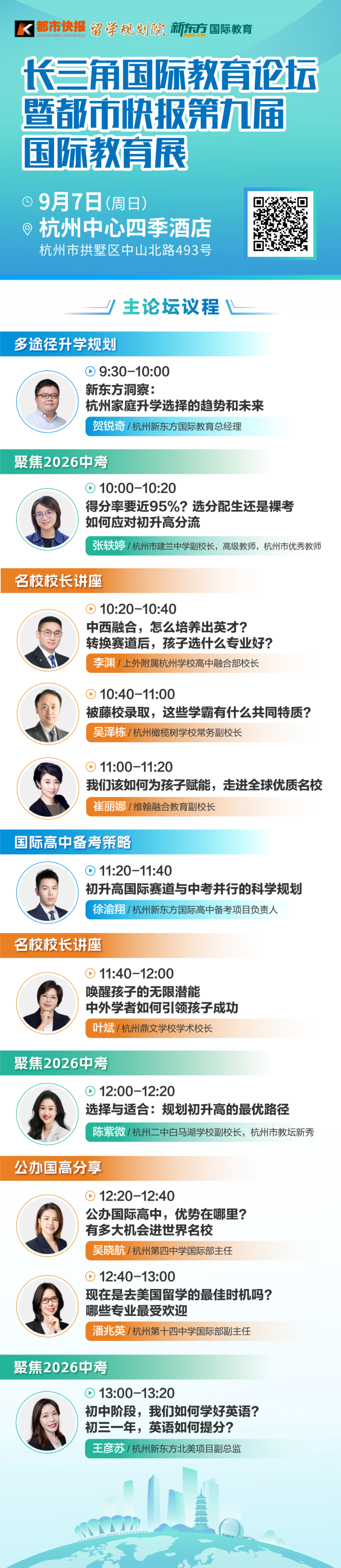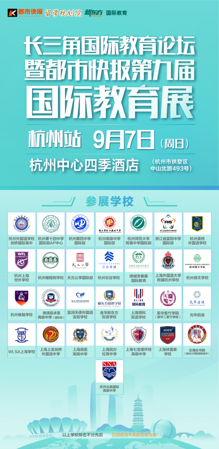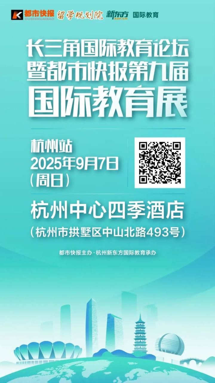 9月7日(周日),由都市快报主办的长三角国际教育论坛暨第九届都市快报国际教育展(杭州站)将在杭州中心四季酒店(中山北路493号)举行。这是2025年秋季全省最大规模的一场国际教育展!