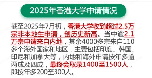 杭州新东方国际教育的一张统计表上显示,截至2025年7月初,香港大学的非本地生申请已经超过2.5万份,创了历史新高,其中有2.1万份申请来自内地。